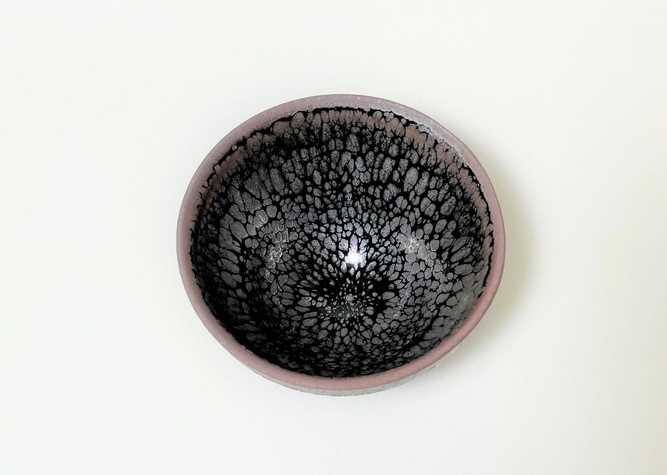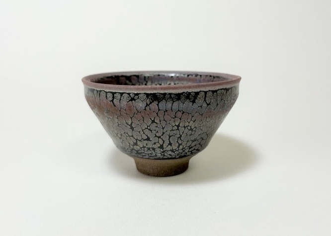 光の当たり方、お酒が入ることで輝きが変化します。 流れるように油滴が表現されています。内側の底の部分は釉薬が溜まる時とそうでない時がありその違いが全体の色調に大きく影響が出ます。 高台の削りは本物の、天目茶碗に劣らぬ端整な仕上げ。 |
