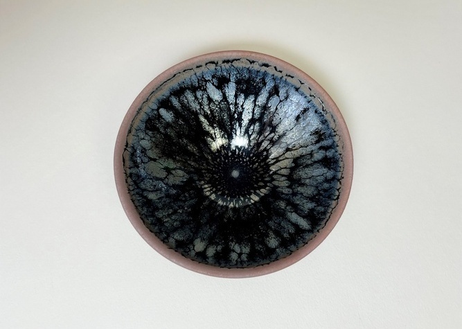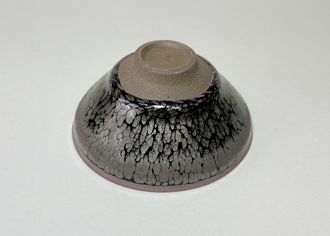 光の当たり方、お酒が入ることで輝きが変化します。 流れるように油滴が表現されています。内側の底の部分は釉薬が溜まる時とそうでない時がありその違いが全体の色調に大きく影響が出ます。 高台の削りは本物の、天目茶碗に劣らぬ端整仕上げ。 |