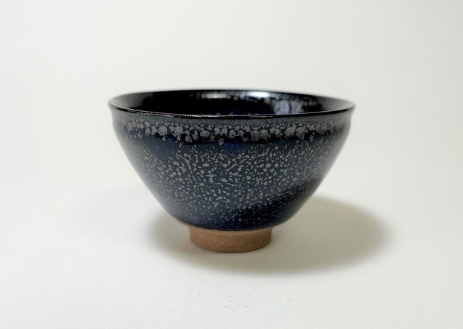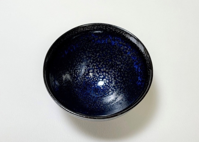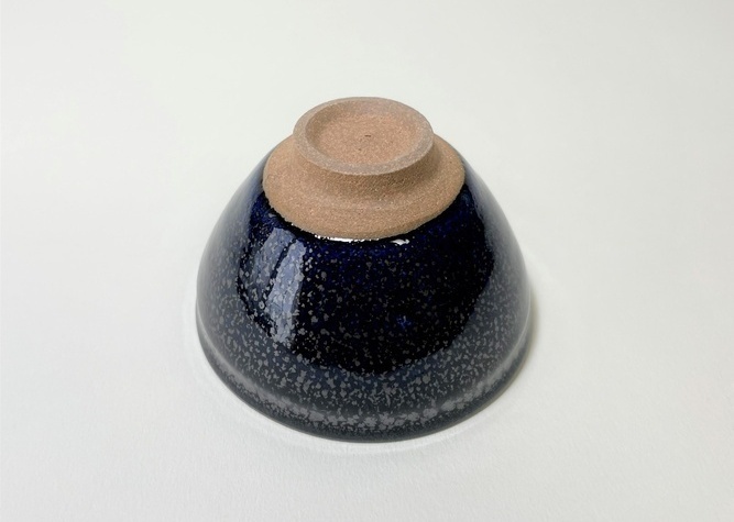 何といっても、酒を注いだ時に、光の屈折の関係で盃の内側に現れる、深海を想わせるマリンブルーの釉調・・鎌田天目の代名詞です。 高台の削りは本物の、天目茶碗に劣らぬ端整仕上げ。 |