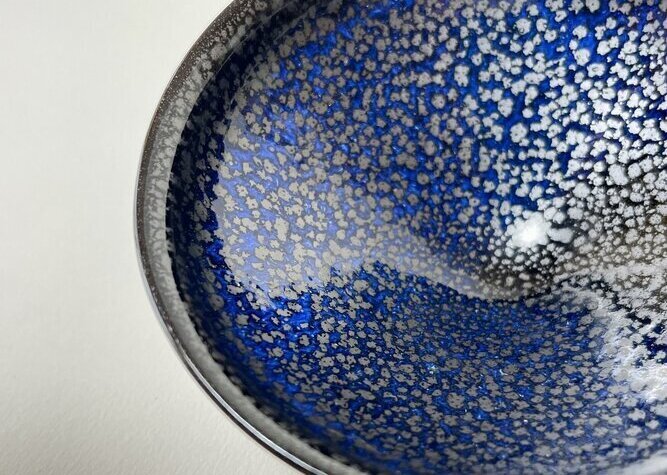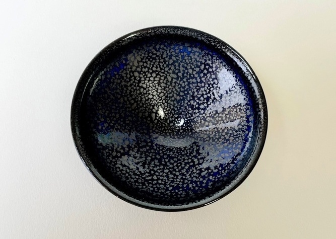 酒を注いだ時に、光の屈折の関係で盃の内側口縁付近に現れる、深海を想わせるマリンブルーの釉調・・鎌田天目の代名詞です。 口縁を手にとった時、天目釉すなわち鉄釉の独特の重量感が心地良い。 全体深い紺色の釉薬に小粒の油滴が上品に表現されている。 端整な高台の削りからは作者の息づかいが感じられます。 |